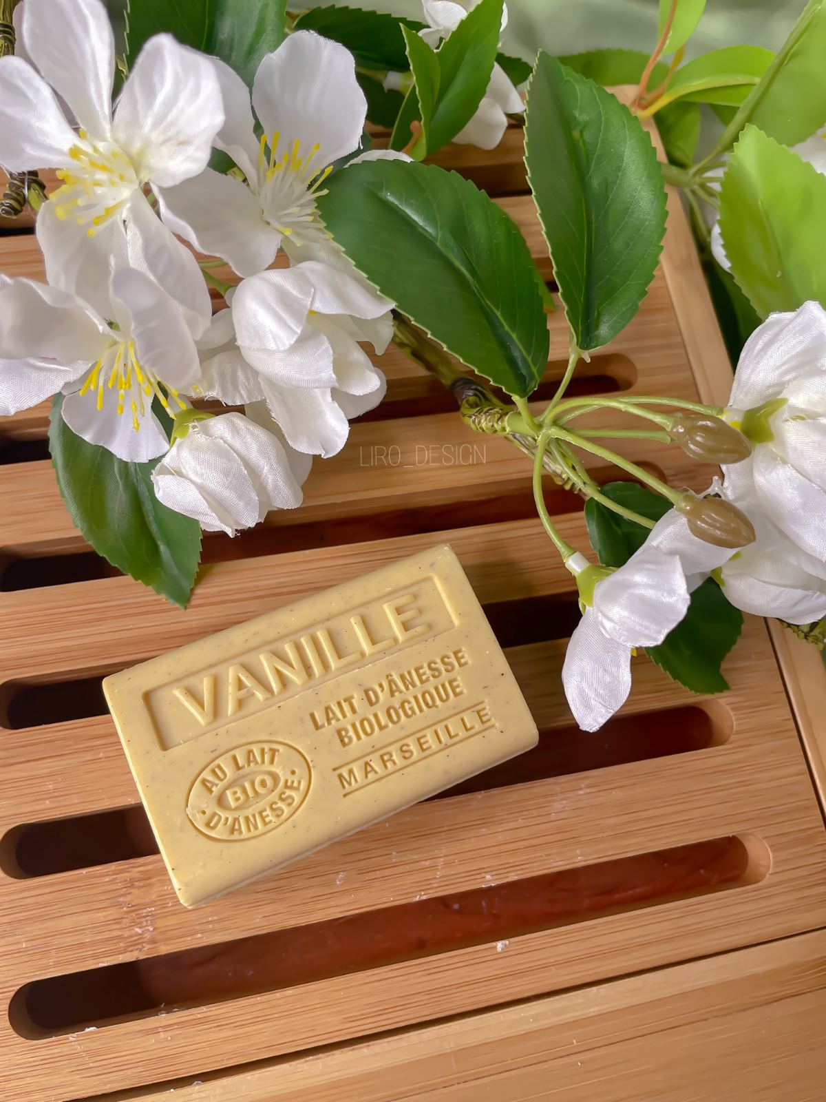Марсельське мило "Ваніль" діє як скраб, видаляє омертвілі клітини і очищає шкіру завдяки маковому насінню, роблячи шкіру м'якою, красивою і гладкою. Його ноти ванілі змішуються з серцевими нотами карамелі, полуниці і мускусу в якості базової ноти. Це ароматне мило підходить для всіх типів шкіри. В милі використано парфум високої якості з міста Грасс.