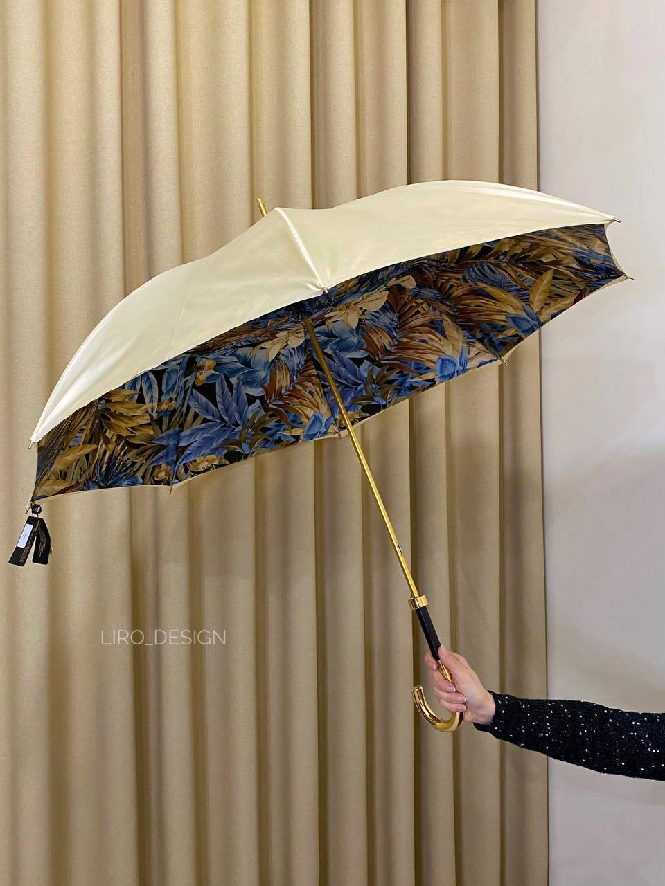 Розкішна парасоля Pasotti благородного кольору вершкового масла з рослинним принтом. Цей стильний аксесуар додасть елегантності будь-якому образу в дощовий день. Ручний механізм відкриття. Ручка з латунні