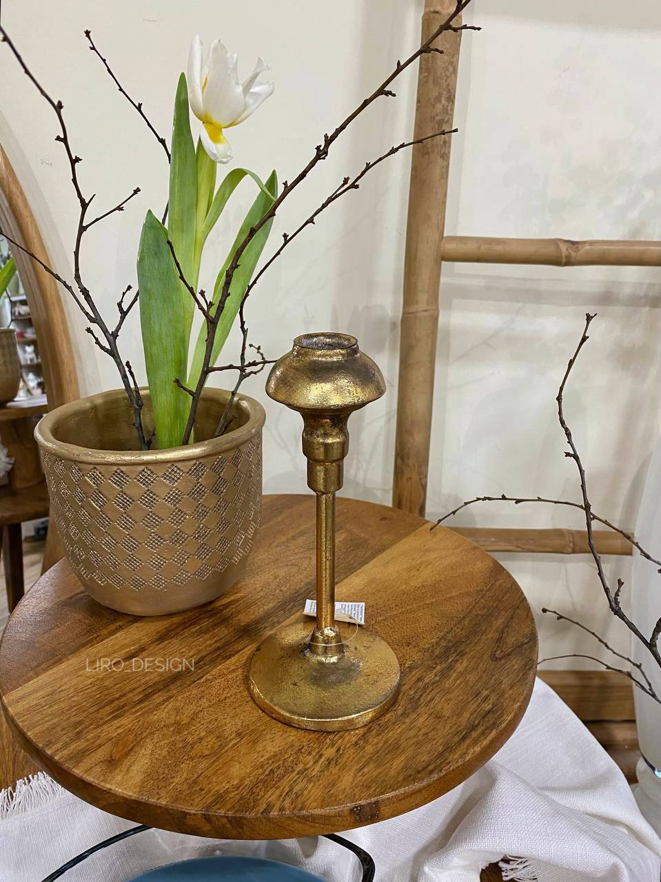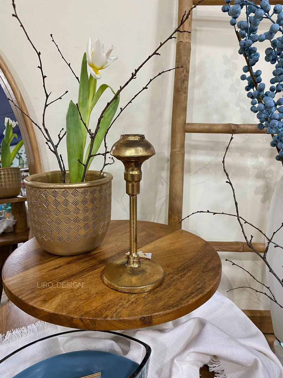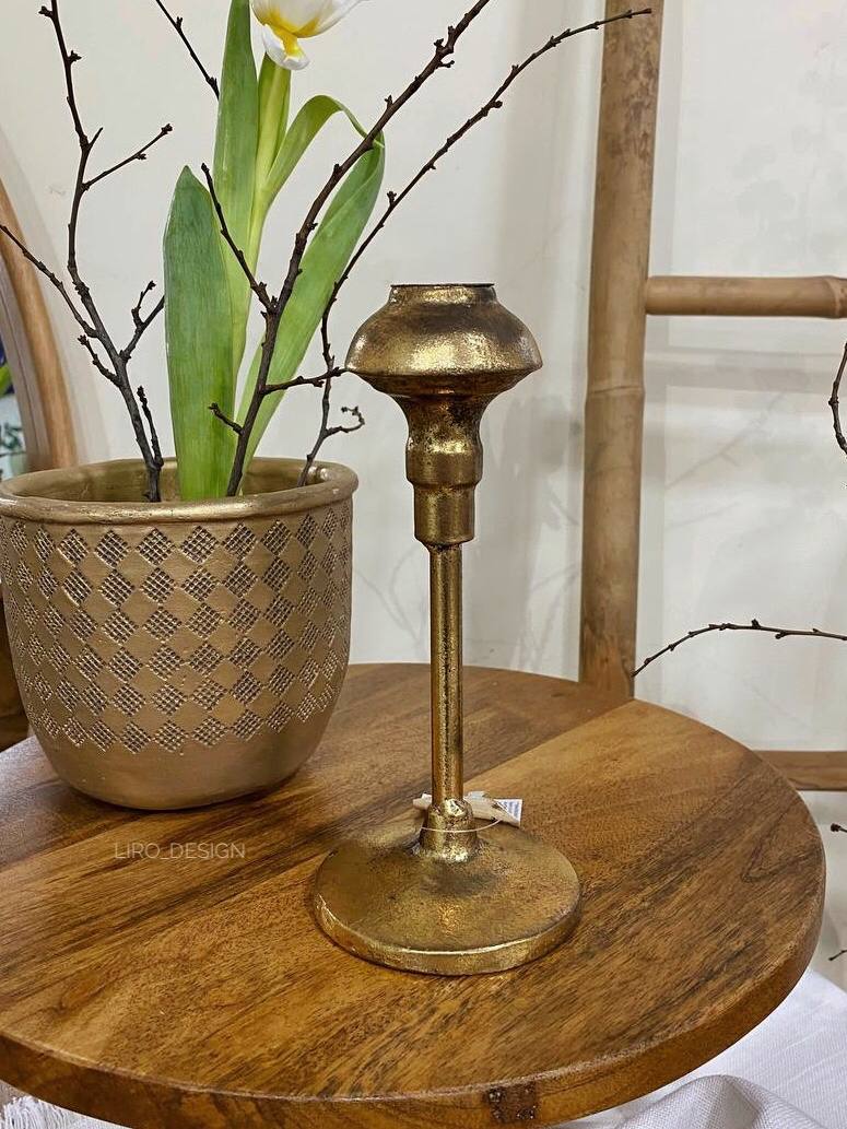 Елегантний металевий підсвічник із золотистим покриттям - стильний аксесуар, який додасть простору тепла, елегантності та завершеності. Лаконічна форма та легкий ефект зістареного металу додає виробу характеру й теплоти, створюючи атмосферу затишку та спокою.