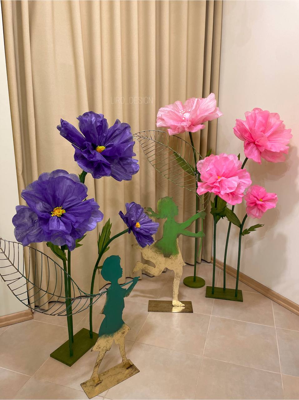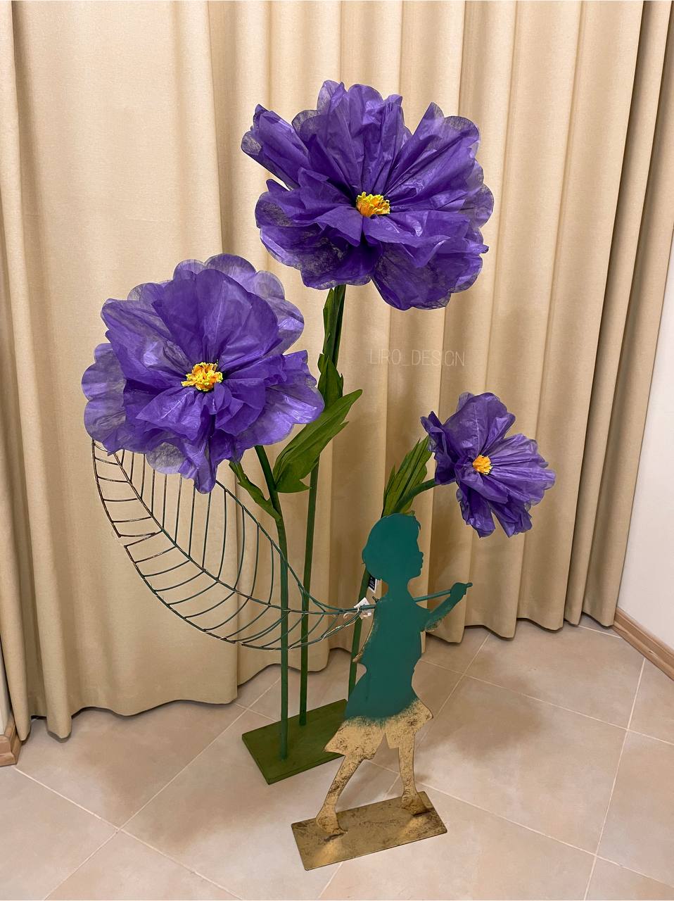 Декоративна композиція з великих квітів із гофрованого паперу — це стильний акцент, що миттєво наповнює простір атмосферою ніжності та витонченості. Глибокі відтінки фіолетового додають композиції елегантності та гармонійно поєднуються з різними стилями інтер’єру — від сучасного мінімалізму до романтичних і святкових оформлень. Завдяки своїм масштабам та виразності, композиція стає центральним елементом простору, привертаючи увагу та створюючи атмосферу свята.