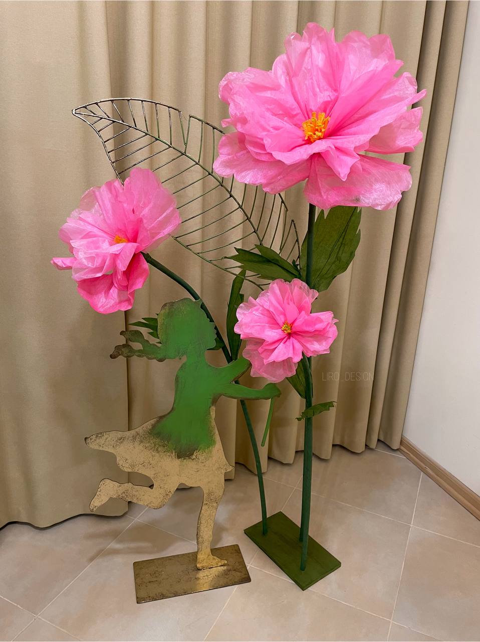 Декоративна композиція з великих квітів із гофрованого паперу — це стильний акцент, що миттєво наповнює простір атмосферою ніжності та витонченості. Завдяки своїм масштабам та виразності, композиція стає центральним елементом простору, привертаючи увагу та створюючи атмосферу свята.