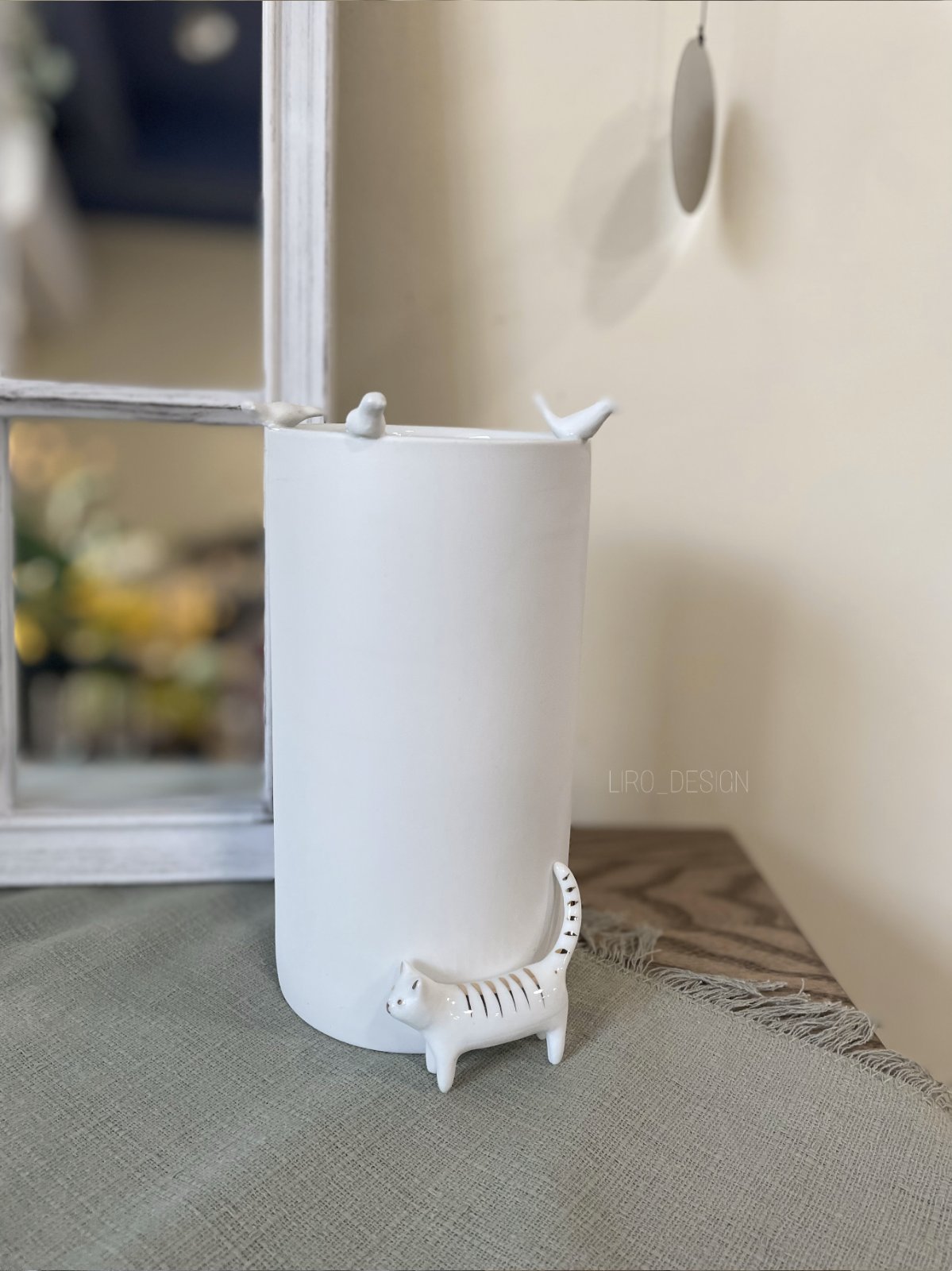Ваза виготовлена з високоякісної порцеляни з матовим білим покриттям, яке контрастує з делікатними золотими акцентами. Об’ємні фігурки птахів на краю та витончені деталі створюють ефект живої композиції та додають виробу особливого характеру. Завдяки мінімалістичній формі та світлій кольоровій гамі ваза гармонійно доповнює сучасний, скандинавський або класичний інтер’єр. Вона виглядає естетично як з квітами, так і як самостійний декоративний об’єкт.