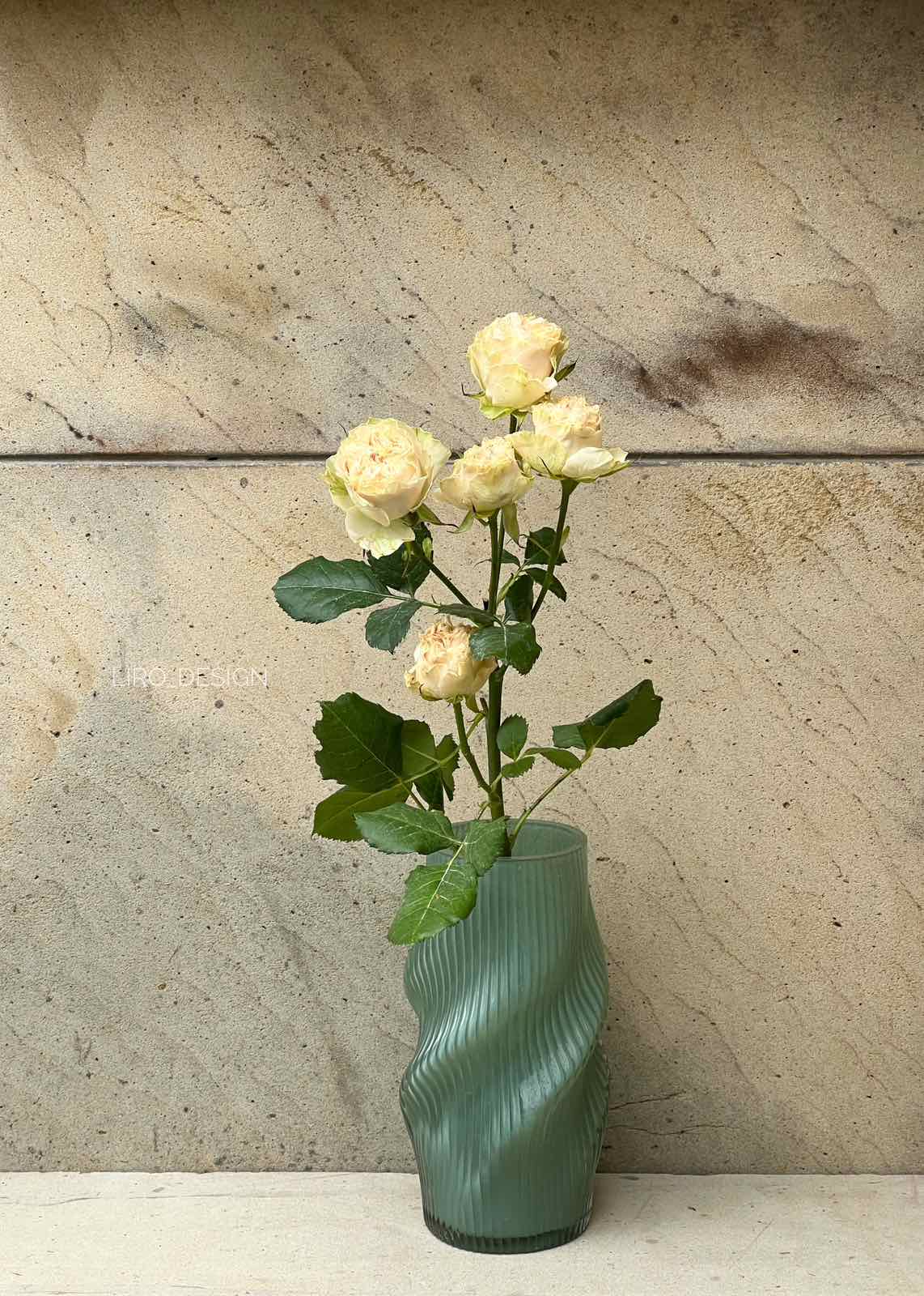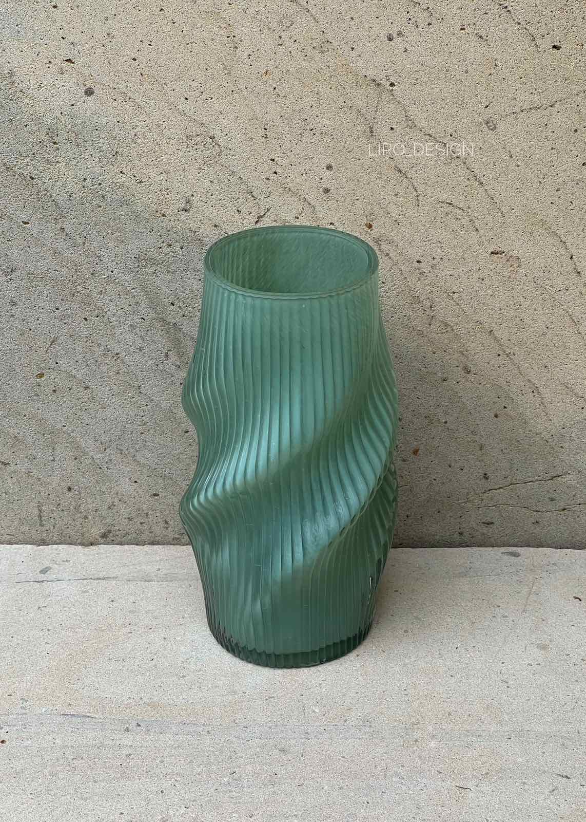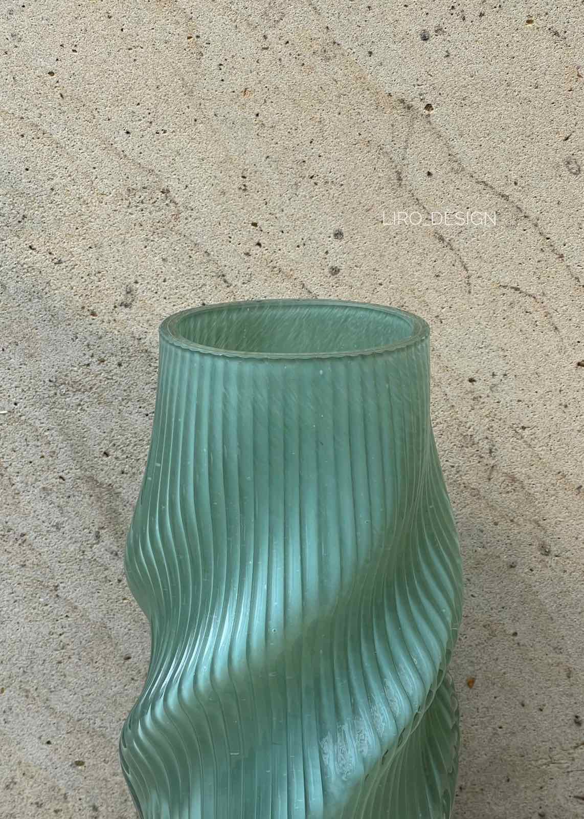Ваза в ніжному нефритовому кольорі з оригінальним скрученим рельєфом. Цей відтінок універсальний: він одночасно має і свіжість зеленого, і стриманість сірої гами.