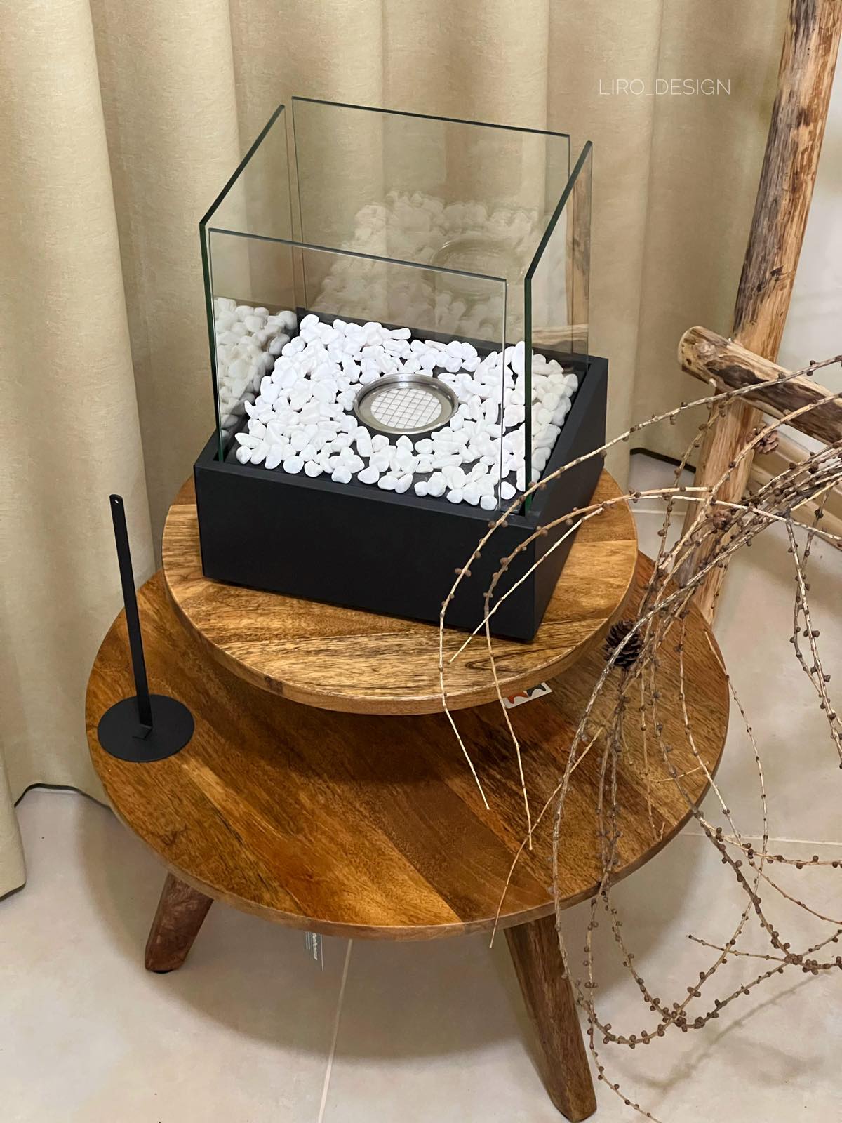 Працює від біоетанолу. Має гасник. В наборі є декоративні білі камінці.